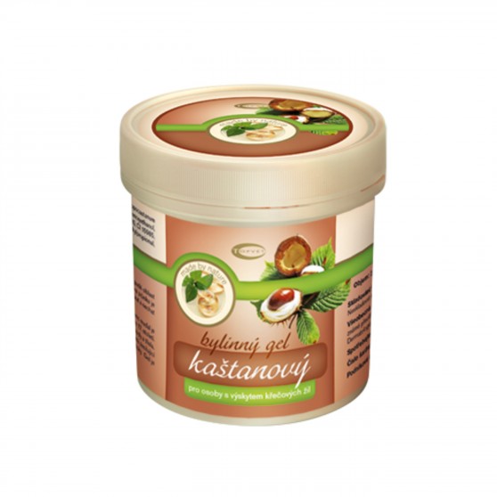 Masážní přípravek na kůži pro osoby s výskytem křečových žil. Jírovec maďal je poměrně mladou léčivkou. Na našem území se objevila až koncem 17. století. Účinnými složkami kaštanu jsou aescin, aesculin, flavonoidní glykosidy a třísla. Užívanými částmi jsou květ, plod, semena a mladá kůra. Aescin má zesilující účinek na žilní stěny a zvyšuje jejich pružnost, pomáhá snižovat otoky. Gel je vhodný k aplikaci ke zklidnění pokožky v oblasti hemeroidů.