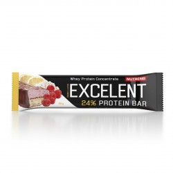 Tyčinka EXCELENT protein bar čokoláda s oříšky 85 g Nutrend. Proteinová tyčinka s ovocem či oříšky, zalitá v mléčné čokoládě nebo jogurtové polevě. Obsahuje 24 % bílkovin, 43 % sacharidů, dále větvené aminokyseliny (BCAA) a neesenciální aminokyselinu L-glutamin.